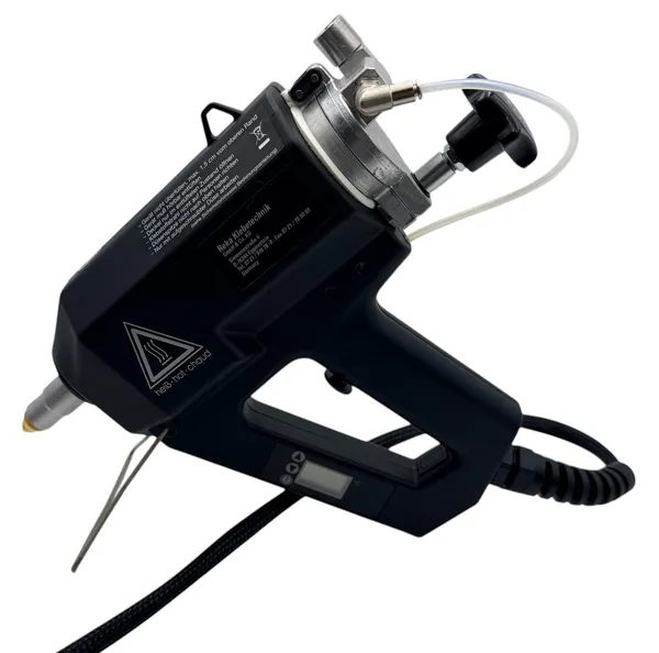 This versatile Reka pneumatic glue gun enables dot, bead, or line application, with optional nozzles available for various application patterns. Its compatibility with multiple adhesive formats offers flexibility and cost-efficiency.