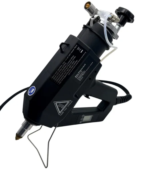 The Reka TR-55 LCD glue gun features electronic temperature control and a clear display for precise temperature settings. It handles both high- and low-viscosity hot-melt adhesives in granulate, pillow, and 43 mm stick forms.