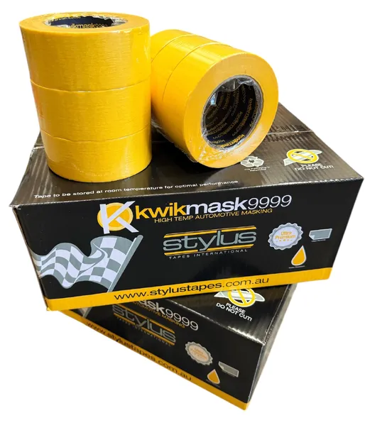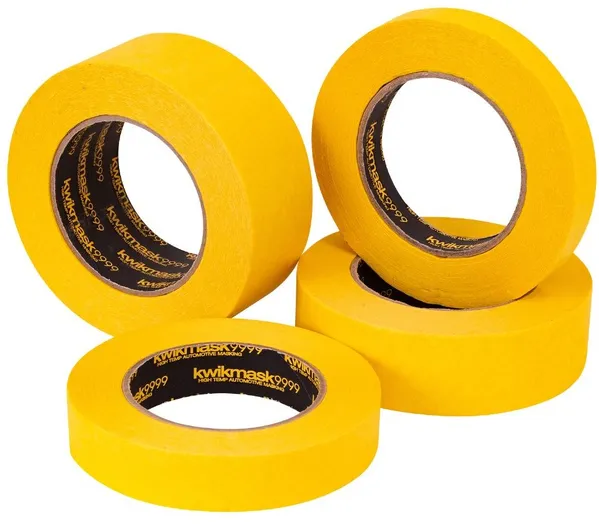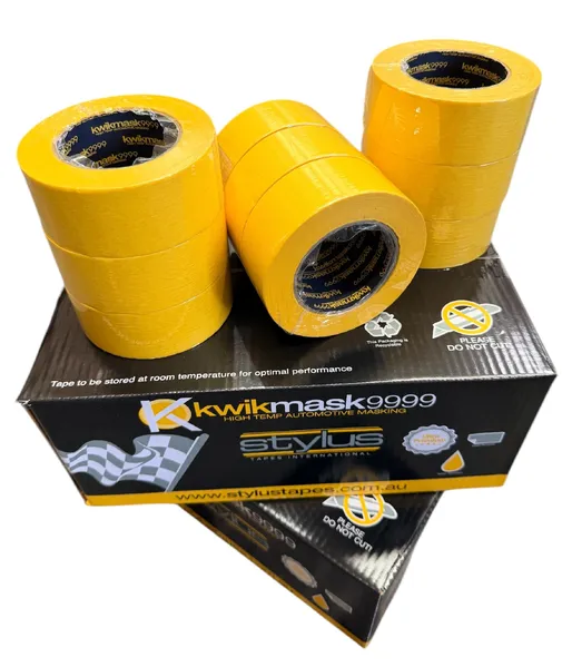 The Sylus KwikMask 9999 Yellow Pro Automotive Masking Tape is a premium high-temperature masking tape designed for the automotive and marine industries. Coated with a specially formulated natural rubber adhesive, it delivers strong adhesion, clean removal from most surfaces, and excellent performance in demanding masking applications. Its high-visibility yellow crepe paper backing is moisture and water-repellent, while the strong crepe construction provides excellent tear resistance and conforms well to irregular surfaces.
